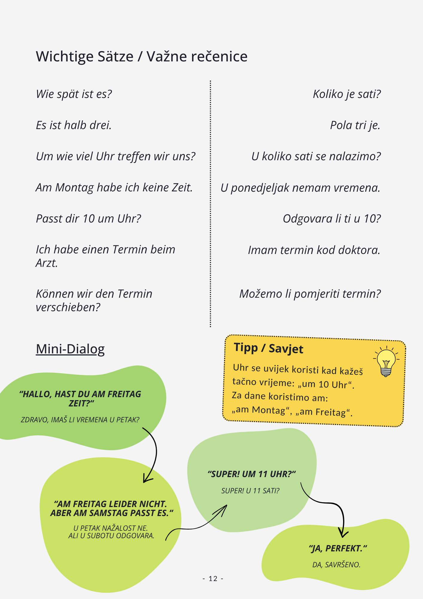 - kako da pitaš za vrijeme i termin, razumiješ sat i datume